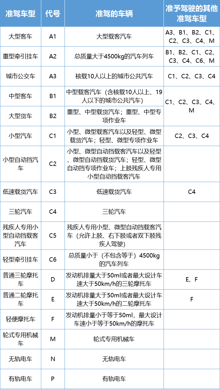 初次申領機動車駕駛證的,可以申請準駕車型為城市公交車、大型貨車、小型汽車、小型自動擋汽車、低速載貨汽車、三輪汽車、殘疾人專用小型自動擋載客汽車、普通三輪摩托車、普通二輪摩托車、輕便摩托車、輪式專用機械車、無軌電車、有軌電車的機動車駕駛證。